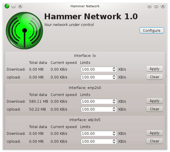 Hammer Network is a Qt application, exclusive for GNU/Linux, designed to use, as backend, WonderShaper, a command line tool to control the network speed usage of the system.