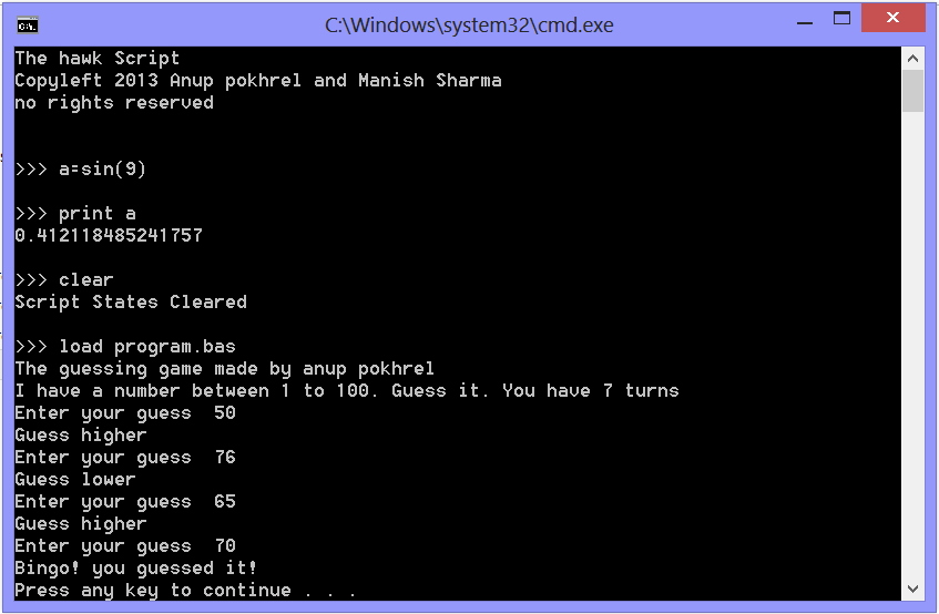 This is the scripting language of the hawk game engine that can be used independently on any project for scripting. The syntax is similar to basic with some influence from python.