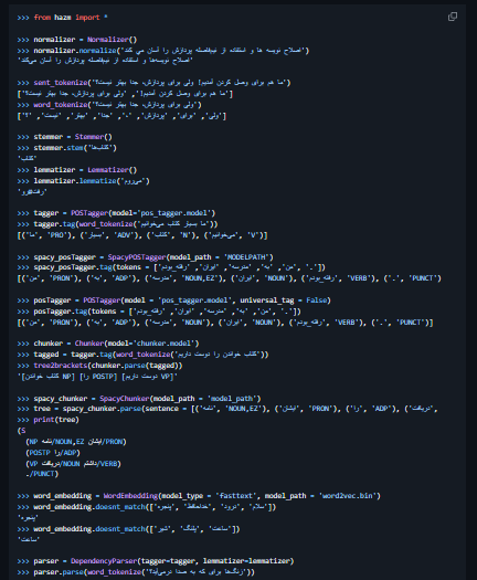 Hazm is a natural language processing (NLP) library for Persian text, offering various tools for text preprocessing, tokenization, part-of-speech tagging, and more.
