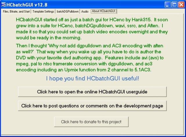 HCbatchGUI is a batch processing front end for HCenc, DGpulldown, & Aften. It will allow the user to save ini files for use in batch encoding and start the batch process for you. A linux GTK version has been added.