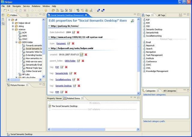 Helper is an integrated PIM and social networking (blog, RSS, foaf, etc) client. Allows to store, annotate and navigate information uniformly by means of folders, tags and categories. Based on OWL, Eclipse RCP and open standards (Dublin Core, foaf, etc).
