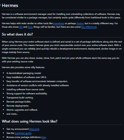 Hermes is a software environment manager used for installing and uninstalling collections of software. While similar to a package manager, Hermes operates differently by defining the entire software stack in a set of package definitions alongside the source code, ensuring strict reproducible control over the software environment. It offers an alternative approach to tools like Homebrew or Docker, with similarities to Nix and Guix.