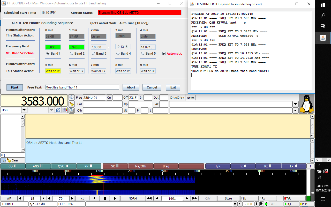When used with Fldigi and a multiband antenna, this tool largely automates the task of testing up to five HF frequencies between two sites. Briefly, one site is configured as a remote site and the other as net control. The remote site transmits a brief text message on each of the five designated frequencies, starting at a prearranged time. The designated net control station (NCS) listens to each band in the same sequence, starting at the same designated time. In the second half of the ten minute cycle, the remote site becomes the listener and the NCS transmits a text message on the band where the remote site's signal was strongest. Both stations then switch to that frequency and start operating. If more than two stations in the net, the other stations can use the tool in Listener mode, and switch to the band announced by the NCS at the end of the sequence.