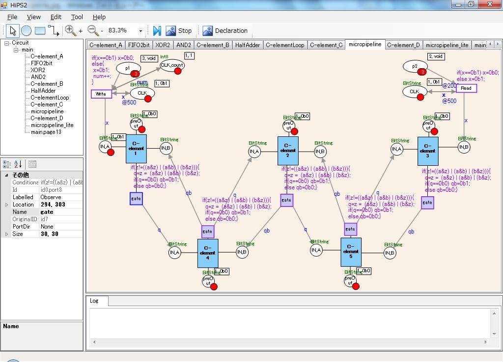 HiPS tool is developed at the Department of Computer Science and Engineering, Shinshu University, which is a tool design and analysis of Petri nets, developed using Microsoft Visual C # and C++. HiPS tool has a way of intuitive GUI which enable hierarchical and/or timed-net design. HiPS tool has also functions of static/dynamic analysis : T-invariant detection, Reachability path analysis, deadlock state detection, and k-boundedness analysis. In addition, it is possible to perform a random walk simulation with each firing steps.