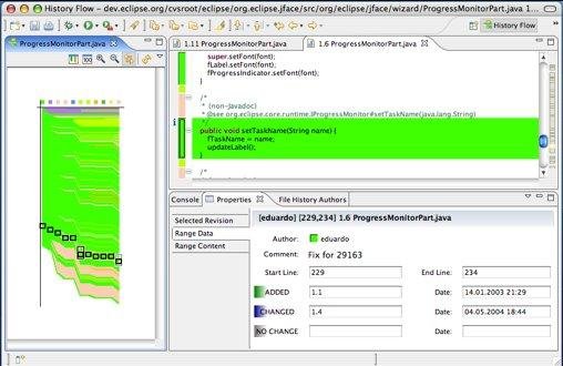 A eclipse plugin for the history of a single file. The history is fetched from the repository and visualized based on annotations. The color describes the authorship or the changes and can be changed. It comes with a powerful metric extension point.