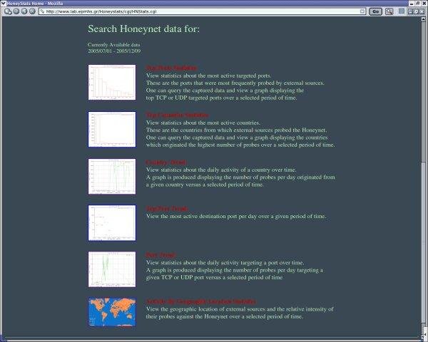 A statistical view of the recorded activity on a Honeynet. A mechanism for a honeynet to present some information about its findings over the web. This is done by a statistical analysis on the inbound firewall logs recorded by the honeynet's firewall.