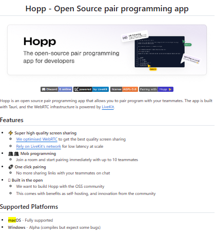 Hopp is an open-source remote pair programming application designed to enable developers to collaborate in real time with high-quality screen sharing and low-latency communication. Built using modern technologies such as Tauri, WebRTC, and LiveKit, it focuses on delivering a fast and seamless experience for distributed teams working together on code. The platform allows multiple users to join shared sessions, making it suitable not only for traditional pair programming but also for mob programming scenarios where several developers collaborate simultaneously. Hopp prioritizes ease of use by enabling one-click pairing, removing the need for sharing meeting links or configuring complex environments. Its architecture leverages a combination of Rust, Go, and TypeScript to balance performance, scalability, and developer ergonomics.