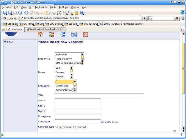 hragency - Recruitment agency software The software provides recruitment agencies with the necessary tools to promote their activites, like: Register open vacancies, publish on web presence, allow searching open vacs, allow registration and deposit of CV