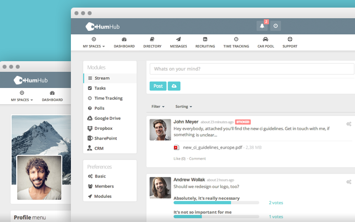 HumHub is a free social network software and framework built to give you the tools to make communication and collaboration easy and successful. It's lightweight, powerful and comes with an user-friendly interface. With HumHub you can create your own customized social network, social intranet or huge social enterprise application that really fits your needs. Boost your business, support your customers, teach your students or organize your football club. It's on you. HumHub is completely open- source. Take advantage of the work already done and even improve it. Every suggestion or help is welcome. With a powerful module system you can extend HumHub by using third party tools, writing your own or connect existing software. Your server, your data, your rules. HumHub is a self- hosted solution and runs on almost every server. You are in the full control of your data. We don't leave you alone. We support you with your projects and provide professional services around HumHub.
