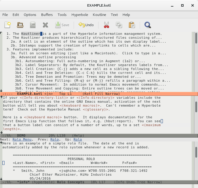 Hyperbole includes easy-to-use, powerful hypertextual button types and links that can be made without the need to learn a markup language. It also includes a hierarchical, record-based contact manager, a rapid window and frame control system and a powerful multi-level auto-numbered outliner.