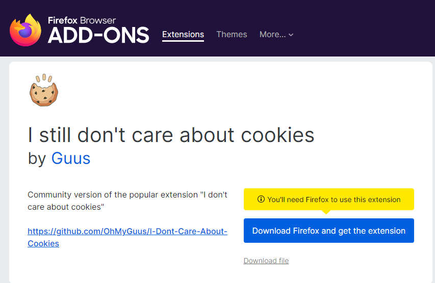 Debloated fork of the extension "I don't care about cookies". Get rid of cookie warnings from almost all websites! This extension has been acquired by Avast and simply I don't trust Avast with my data. Also having it on Github allows us to improve the code & add support for websites faster. The EU regulations require that any website using tracking cookies must get user's permission before installing them. These warnings appear on most websites until the visitor agrees with the website's terms and conditions. Imagine how irritating that becomes when you surf anonymously or if you delete cookies automatically every time you close the browser. This add-on will remove these cookie warnings from almost all websites! You can report any website which still warns you about cookies: just click 'Report a cookie warning' from the extension menu (the brown cookie image next to your address bar).