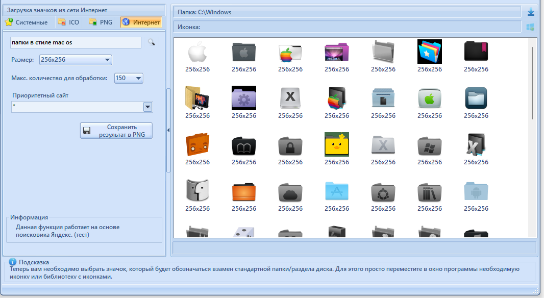 A program that allows the user to easily change the icon of a folder, disk partition, file type, or group of folders/partitions at once to any one you specify (ICO, PNG, JPG, DLL, etc.), these icons can be selected from your collection, or from those supplied with the program, as well as find the ones you need using the built-in function from the Internet with the ability to save them in your collection. For ease of use of the program, step-by-step instructions are built in, which show sequentially what actions need to be performed at the moment. Additionally, the program has the function of setting a note for a folder.