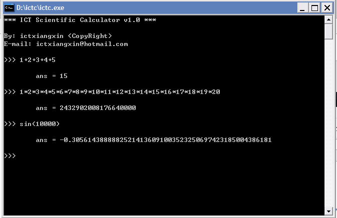 ictc is a formula calculator, and it's also a high-precision calculator.I finished some normal math function like sin(x),cos(x),exp(x)...,and these functions have high convergence speed,so this tool(light weight) may be a good daily assistant for data reckoner. I holp this kid-tool will become more perfect and can do more special computing.
