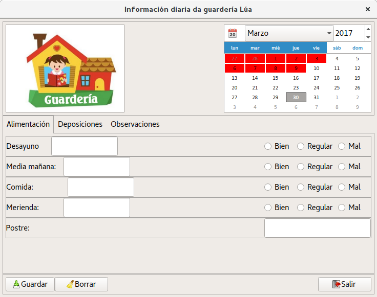 Programa para llevar el control de los informes diarios de la guardería de un bebé. Cuando se lleva a un bebé a la guardería lo normal es que proporcionen un pequeño informe, diciendo cuanto durmió, lo que comió, que cantidad, si hizo deposiciones, etc. Este programa almacena toda esta información para que sea facilmente accesible.