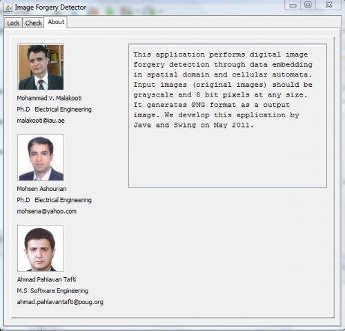 This application performs digital image forgery detection through data embedding in spatial domain and cellular automata. Input images should be grayscale at any size. It generates PNG format as a output image. Developed by Mohammad V. Malakooti.