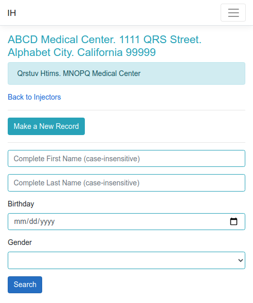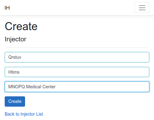 An injection site can use the web application by: First register the site (site name, address, state, zipcode). Then record vaccines available at the site. Next, record injectors. Each injector can click Begin to start. The injector can fill out