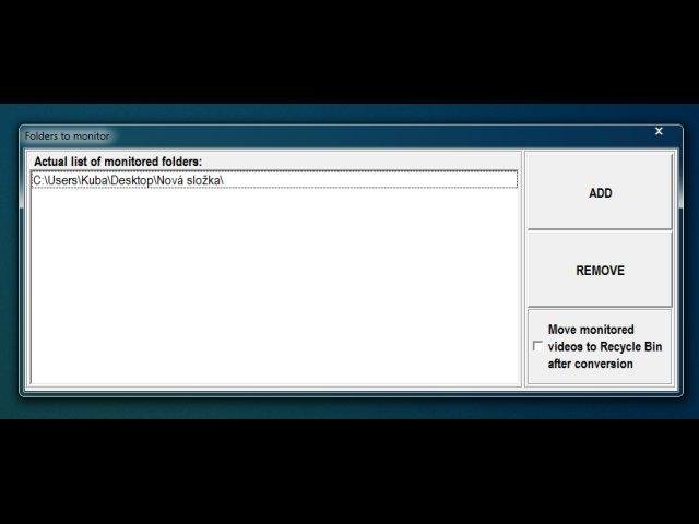 - it can monitor a folder on your computer and everytime when new video is inserted into this folder then it will automaticaly start conversion of this video; if subtitles with the same name as a video are located in the same folder, then is used automaticaly; you can set that source videos will be automaticaly will be deleted after conversion