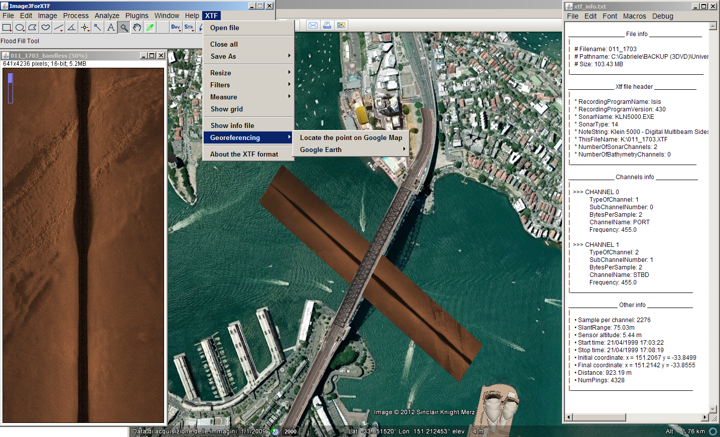 This project was born from a stage at the "Signals and Images Lab (si.isti.cnr.it), Institute of Information Science and Technologies of the National Research Council of Italy". ImageJforXTF extends the open source ImageJ software with functionalities that allow to open and manage XTF files. This kind of files is used to record sonar and bathymetric data. An user can choose to open any file with extension ".xtf" so that the program parses it and shows the resulting image. Then the user can resize the image, apply graphic filters, perform measurements and georeference the recorded data using GoogleMap and GoogleEarth, in addition to using the basic functionality offered by ImageJ.
