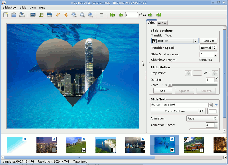 Imagination is a lightweight and simple DVD slide show maker written in C language and built with the GTK+3 toolkit and Cairo featuring 69 transitions. It requires the ffmpeg encoder and libsox to export the slideshow.