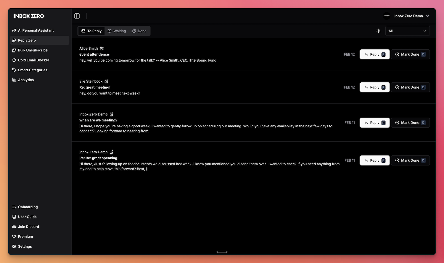 Inbox Zero is an open source AI-powered email assistant designed to help users manage and process their inbox more efficiently. It aims to reduce the time spent handling email by automatically organizing, prioritizing, and responding to messages using customizable automation rules and artificial intelligence. Users can define prompts or rule-based actions that guide how the assistant processes incoming messages, enabling automated workflows for sorting, replying, or handling routine communication. Inbox Zero is structured as a modern web application built with a monorepo architecture that contains multiple applications and shared packages, allowing modular development and easier maintenance. It integrates with email services and can automate actions such as scheduling tasks, generating replies, and managing follow-ups. Inbox Zero is designed to allow users to retain precise control over automation rules while still benefiting from AI-driven suggestions and analysis.