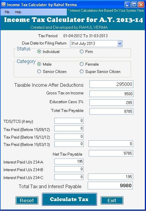 Income Tax Calculator with Interest Calculations U/S 234-A 234-B 234-C for A.Y. 2013-14.