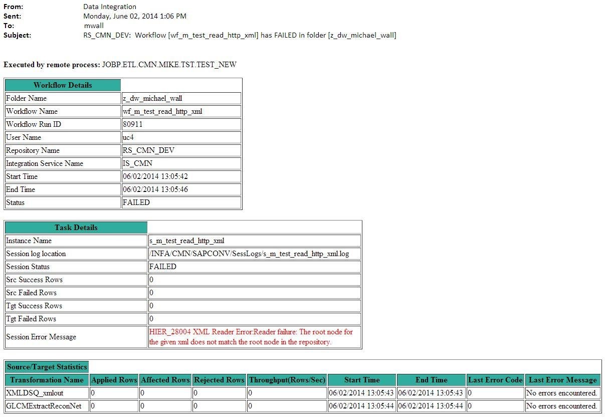 The e-mail sent is in HTML format using tables and looks similar to the workflow monitor output.
