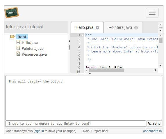 Infer is a static analysis tool - if you give Infer some Java or C/C++/Objective-C code it produces a list of potential bugs. Anyone can use Infer to intercept critical bugs before they have shipped to users, and help prevent crashes or poor performance. Infer checks for null pointer exceptions, resource leaks, annotation reachability, missing lock guards, and concurrency race conditions in Android and Java code. Infer checks for null pointer dereferences, memory leaks, coding conventions and unavailable API’s. Start with the Getting Started guide and our other docs to download and try Infer yourself. Infer is still evolving, and we want to continue to develop it in the open. We hope it will be useful for other projects, so please try it out or contribute to it, join the community and give us feedback!