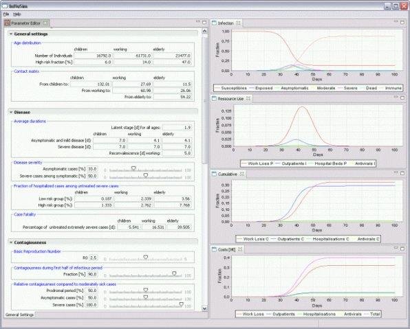 A deterministic pandemic influenza simulator. Computes the effect of interventions like antiviral treatment of cases and social distancing. To be used for pandemic preparedness planning by health care offices. OS-independent Java/SWT/RCP/Applet.