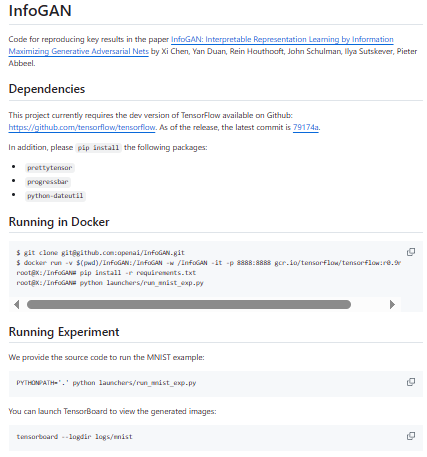 The InfoGAN repository contains the original implementation used to reproduce the results in the paper “InfoGAN: Interpretable Representation Learning by Information Maximizing Generative Adversarial Nets”. InfoGAN is a variant of the GAN (Generative Adversarial Network) architecture that aims to learn disentangled and interpretable latent representations by maximizing the mutual information between a subset of the latent codes and the generated outputs. That extra incentive encourages the generator to structure its latent space in a way where certain latent variables control meaningful, distinct factors (e.g. rotation, width, stroke thickness) in the output images. The repository includes code for experiments (e.g. on MNIST), launcher scripts, and some tests. It depends on a development version of TensorFlow (the code expects features not in older stable releases), and also uses other libraries like prettytensor and progressbar.