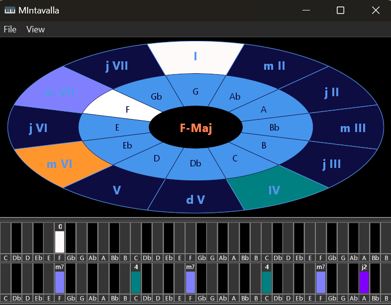It illustrates musical events by analysing and specifically colouring chord intervals (lower harmony keyboard) and melody intervals (upper melody keyboard) in realtime: