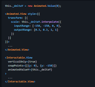 This is an experimental implementation of a declarative API for handling fluid user interactions with views at 60 FPS in React Native. Here are some example use-cases for views that users can interact with. Swipeable card (a la Google Now) springing into place unless swiped away with enough force. Drawer snapping between closed and open with buttons appearing gradually as it's being dragged. Collapsible header that snaps to a smaller size as the content below is being scrolled. Chat heads (a la Facebook Messenger) that can be dragged around but snap to corners of the screen. All of these use-cases have views that continuously interact with the user's gestures. These interactions are normally physical in nature, having properties like springiness, friction, elasticity and damping. In order to feel natural on a touch device they need to run at 60 FPS.