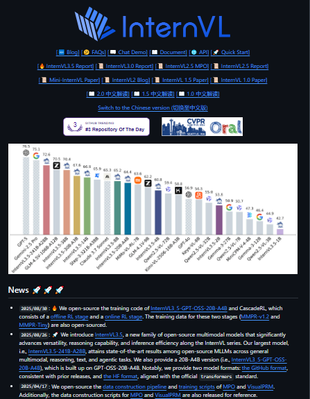 InternVL is a large-scale multimodal foundation model designed to integrate computer vision and language understanding within a unified architecture. The project focuses on scaling vision models and aligning them with large language models so that they can perform tasks involving both visual and textual information. InternVL is trained on massive collections of image-text data, enabling it to learn representations that capture both visual patterns and semantic meaning. The model supports a wide variety of tasks, including visual perception, image classification, and cross-modal retrieval between images and text. It can also be connected to language models to enable conversational interfaces that understand images, videos, and other visual content. By combining large-scale vision architectures with language reasoning capabilities, the project aims to create a more general multimodal AI system capable of handling diverse real-world tasks.