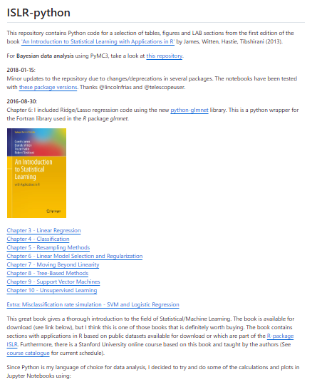ISLR-python is an educational repository that provides Python implementations and notebooks corresponding to examples and exercises from the book An Introduction to Statistical Learning. The project recreates tables, figures, and laboratory exercises originally presented in the book so that readers can explore the concepts using Python rather than the original R environment. The repository includes Jupyter notebooks demonstrating statistical learning methods such as linear regression, classification algorithms, resampling methods, and model evaluation techniques. These notebooks combine theoretical explanations with practical coding exercises that allow users to reproduce the analyses described in the book. The datasets used in the book are also included so that users can run experiments directly within the provided notebooks. By translating the statistical learning material into Python code, the repository makes the book’s concepts accessible to a wider community of Python users.