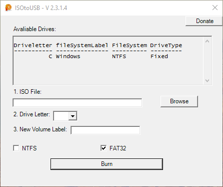 ISOtoUSB is a simple tool that allows you to burn a ISO file to a attached or removable drive. The tool allows you to format the drive to either NTFS or FAT32.