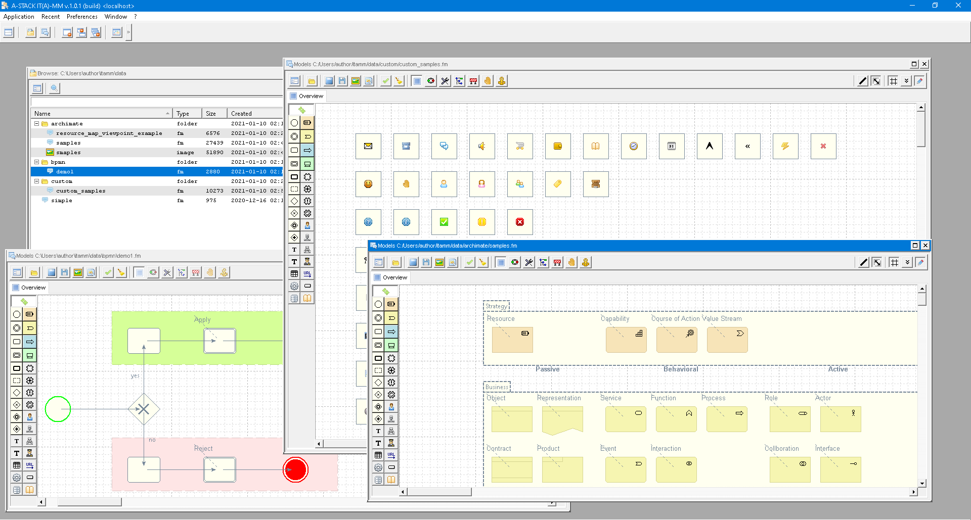 IT(A)-MM is a tool to design models of solutions, services and enterprise processes. It allows you to visualize data using popular BPMN and ArchiMate visualization notation. It also has its own extensible notation for visualizing enterprise environment objects. IT(A)-MM is easy to use and allows you to use it wherever you are.