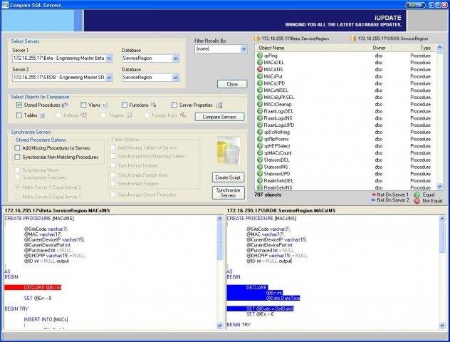 iUPDATE is used to update, compare, and synchronize multiple SQL servers. Keep all server groups (development, QA, production) up to date, and easily execute SQL files on multiple database servers. Great for quickly deploying new stored procedures.