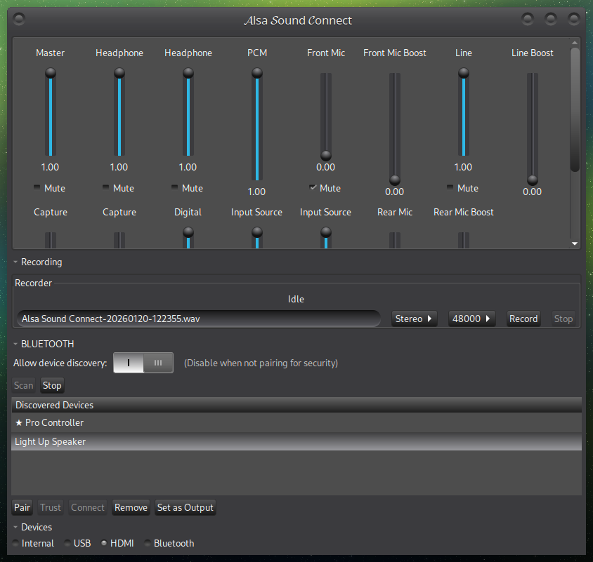 Device switching - Change output between Internal/USB/HDMI/Bluetooth without restarting JACK. Audio Routing ALSA → JACK pipeline - All ALSA apps route through JACK.