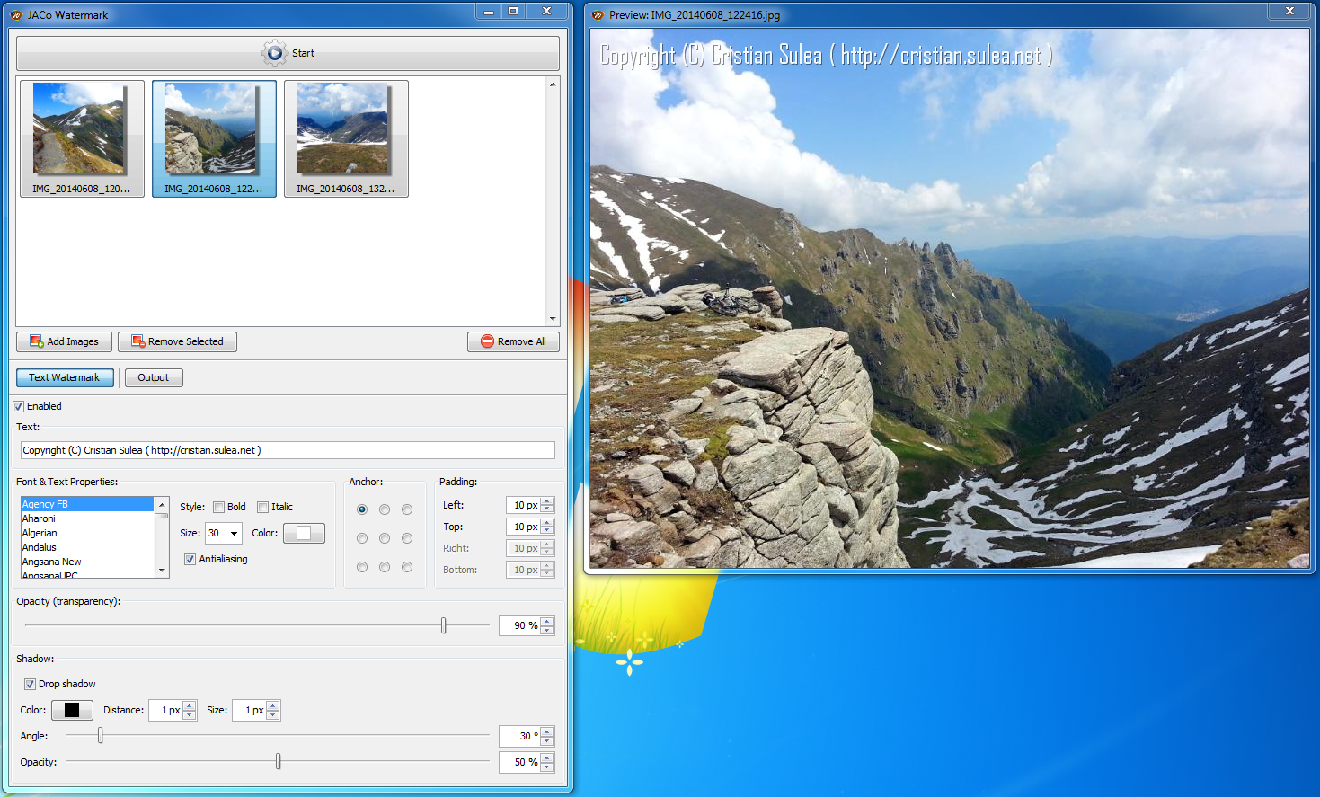 A free open source Java application created to help you apply watermarks to your pictures in order to protect them from unauthorized distribution. Different font, color, size and transparency texts or images can be added as a watermark. Batch processing is also provided.