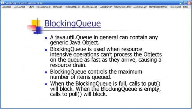 Java provides the concurrent library that simplifies concurrent programming, but this is hard to learn and visualize. This project is a series of animations each illustrating the coding and usage of a component in the java concurrent library.