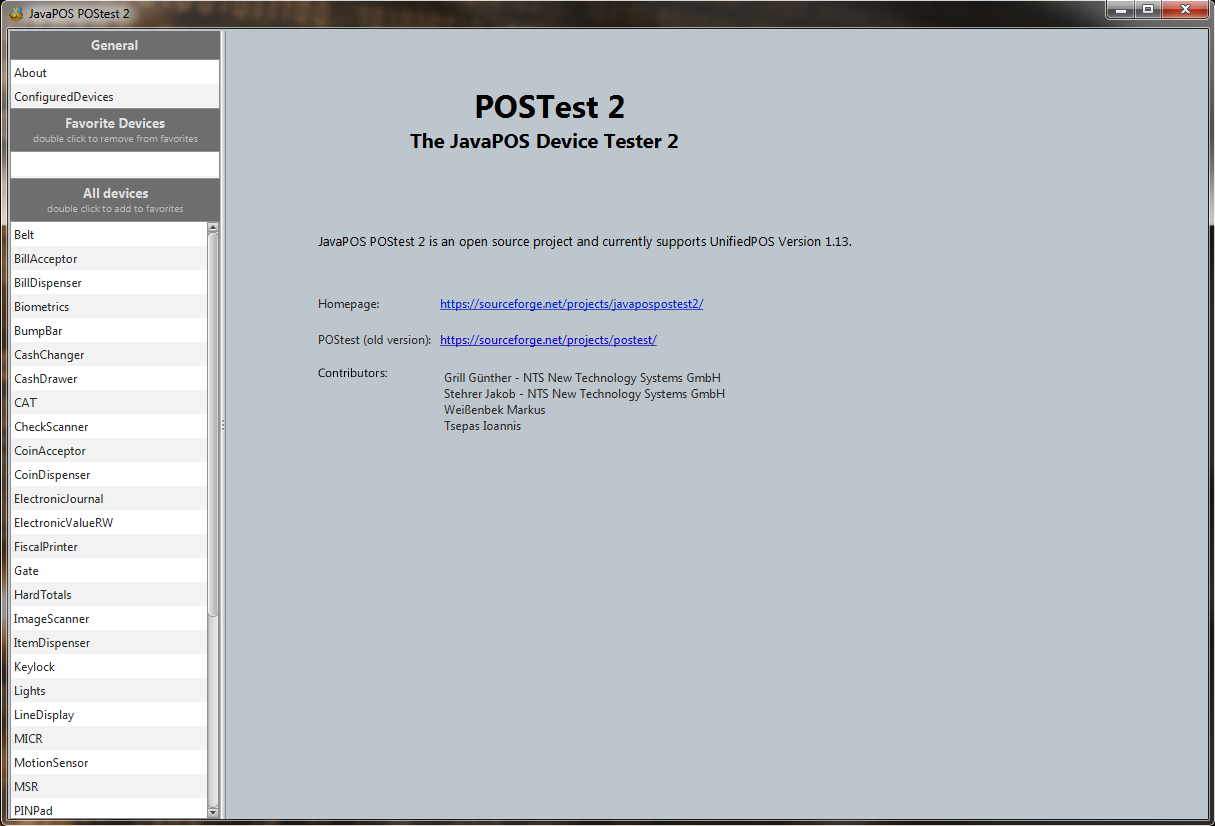 If Java 7 is no option for you, just use the old POStest (limited to JavaPOS v1.10) at: