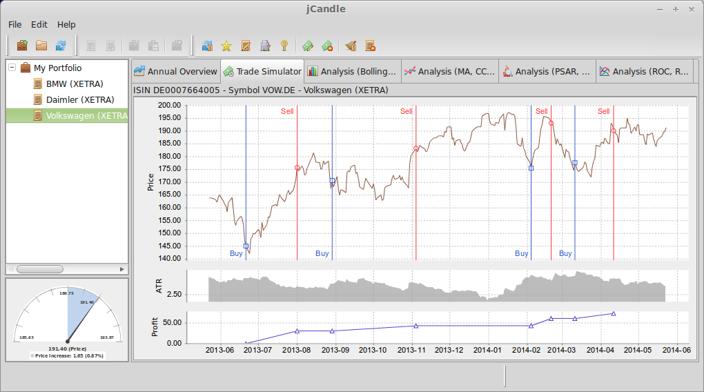 The trade simulator simulates several indicators with various parameter combinations. The trade simulator autoselects the indicator parameters giving the best profit for a each indicator type. The combination of the indicator reversal signals and the detected candlestick patterns returns the overall probability for a purchase or disposal. The indicators computed with the best profit parameters will be shown on different analysis charts.