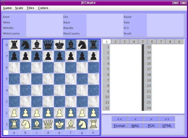 JECmate is an application to help manage chess games played by mail or email. Written in Java it will support the creation of messages and the sending of those messages by email. It may also be used as an interface to third-party chess engines.