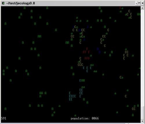 Jecology is a life simulator with many configurable options. It is developed in C++ and uses ncurses. It currently compiles for GNU Linux/Unix and Cygwin, but soon native MS Windows support will be added. It currently utilizes a command line interfac