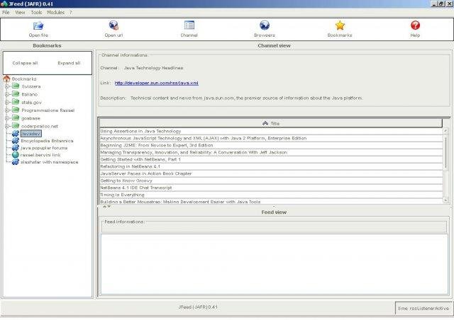 JFeed (JAFR) - "Just Another Feed Reader" is a feed aggregator created in java and compatible with multiple rss versions and operating system. It supports module plug-ins and restricted area access