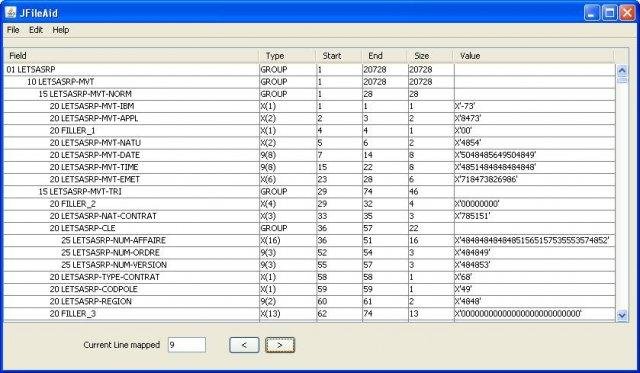 A graphical Java based fileaid like software. It allows you to load a cobol copybook, display its fields properties and map them with the lines of a file. This project is no longer supported. If you still need such a tool, please check OpenFileAid.