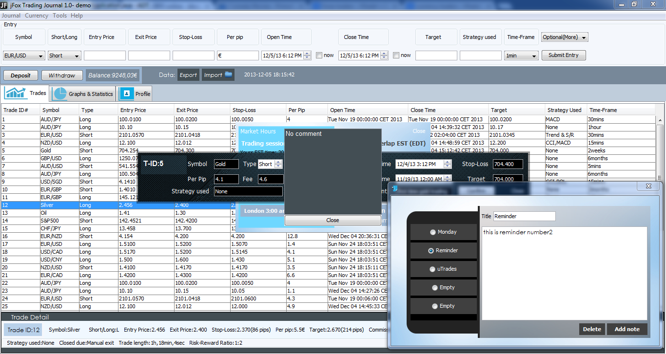 jFox Trading Journal is software developed mainly for currency traders,it provides advanced data analysis to improve traders ability to reach higher profits and eliminate losses.jFox keeps your data in one place.To access or modify any of your data jFox provide simple user friendly GUI.By generating graphs and statistics automaticly,user only needs to provide his data to have full overview over his trades and trading performance.