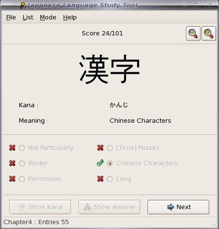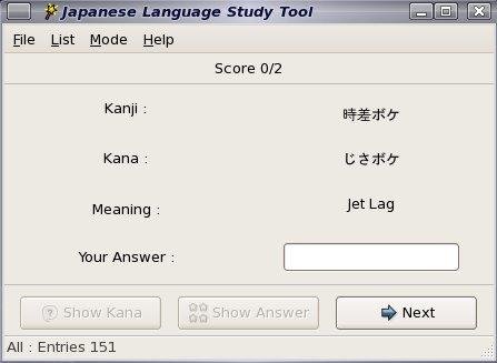 The Japanese Language Study Tool is an attempt to produce an application to help people learning the Japanese language. It currently contains support for managing vocabulary lists displaying both Kanji and Kana readings. Requires PyGTK - www.pygtk.org