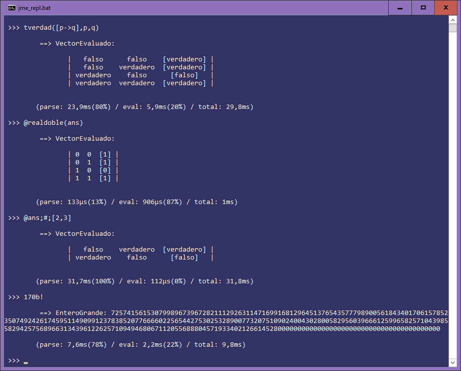 También implementa un potente modo REPL que permite usar interactivamente la mayoría de características del lenguaje implementado por la biblioteca JME, incluida la importación y exportación CSV, HTML, JSON y XML.