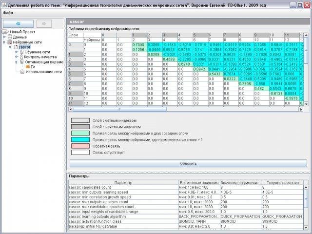 Program to performing the complete cycle of neural networks analysis: preparing data, choosing neural network (CasCor, MP, LogRegression, PNN), learning of network, monitoring learning state, ROC-analysis, optimization of network parameters using GA.