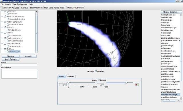 Java Open Particle system is a Java based particle system simulation library. Is has a GUI, done in SWING to build your own particle systems and save/load them. The file format is a simple zip file with a XML file inside. It has a Swing Editor too. The p